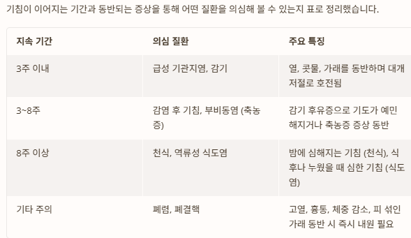 ⚠️주의: 3주 이상 지속되는 만성 기침, 고열, 흉통, 숨 가쁨, 체중 감소, 피 섞인 가래, 특히 야간에 심해지는 기침 등은 폐렴, 폐결핵, 천식 악화 등 심각한 질환의 신호일 수 있습니다.