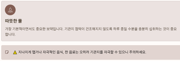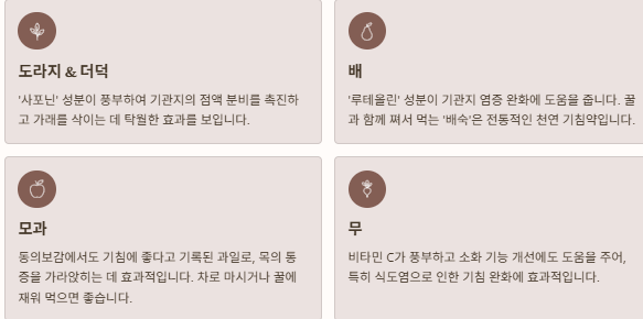 ⚠️ 지나치게 맵거나 자극적인 음식, 찬 음료는 오히려 기관지를 자극할 수 있으니 주의하세요.