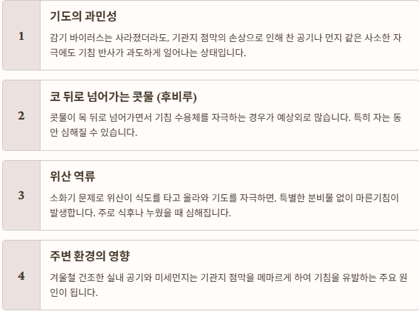 1. 기도의 과민성: 감기 바이러스는 사라졌더라도, 기관지 점막의 손상으로 인해 찬 공기나 먼지 같은 사소한 자극에도 기침 반사가 과도하게 일어나는 상태입니다.