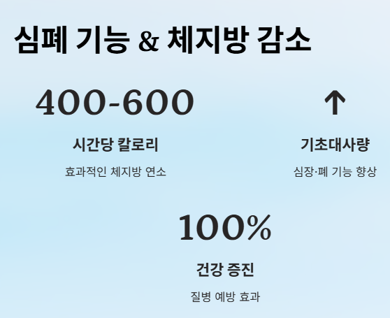 운동 강도에 따라 다르지만, 일반적으로 1시간 동안 약 400~600kcal를 소모할 수 있습니다. 이는 체지방 감소에 매우 효과적이며, 꾸준히 실천하면 심장과 폐의 기능이 향상되어 기초 대사량이 높아지고 쉽게 지치지 않는 튼튼한 체력을 갖게 됩니다. 이는 곧 전반적인 건강 증진과 질병 예방으로 이어집니다.
